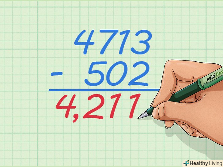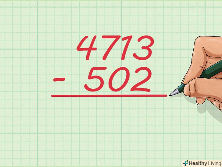 Наприклад, вирішіть 4713-502. запишіть числа одне під іншим (тобто так, як ви записуєте їх для віднімання в стовпчик).- Ви можете написати 0 під 4, якщо хочете. Ви завжди можете написати нулі перед будь-яким числом (від цього значення числа не зміниться). Переконайтеся в тому, що ви пишете нулі перед числом, а не після нього.