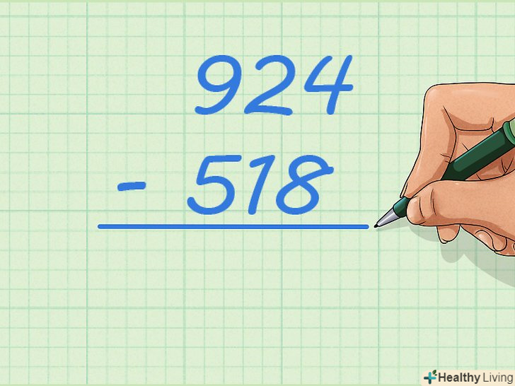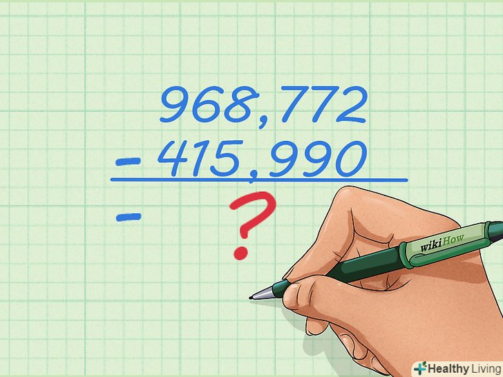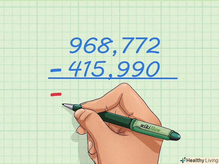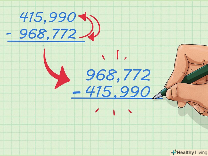 Тепер віднімемо більше число з меншого числа. Наприклад, вирішите 415990 - 968772. Щоб визначити, яке з чисел однакової значності більше, просто подивіться на перше число зліва. У нашому прикладі 9 більше 4, отже, віднімається більше зменшуваного.- Переконайтеся в тому, що ви порівнюєте числа чисел однакової значності. 912 не більше 5000, тому що 5000 – це чотиризначне число, а 500-тризначне.