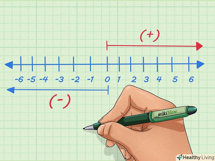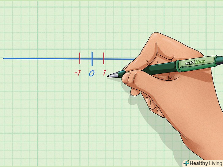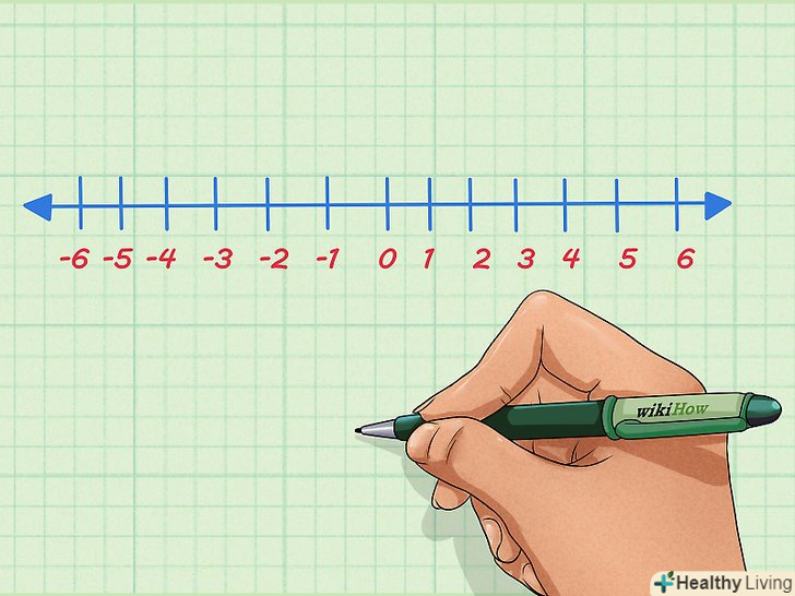 Нанесіть на числову пряму більше чисел (зліва від -1 і праворуч від 1). зліва від -1 поставте мітки і напишіть під ними -2, -3, -4 і так далі. Праворуч від 1 поставте мітки і напишіть під ними 2, 3, 4 і так далі.- На малюнку показана числова рядок з числами від -6 до + 6.