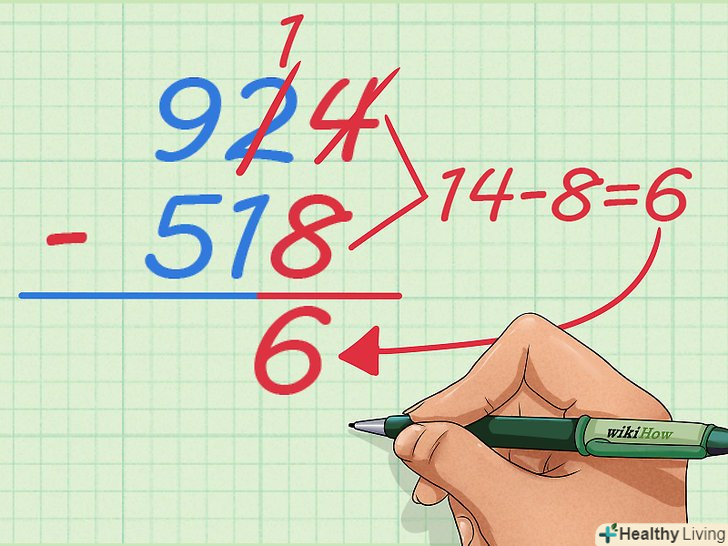 Почніть з 4-8.оскільки 4 менше 8, а негативні цифри у відповідь не пишуть, виконайте наступні дії:- У верхньому числі другу цифру праворуч зменшіть на одиницю; результат напишіть над цією цифрою. У нашому прикладі закресліть 2, а над нею напишіть 1.