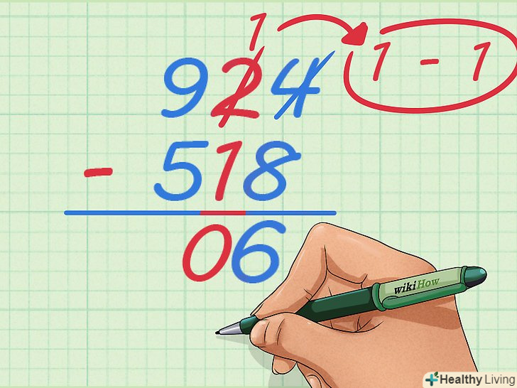 Перейдіть до наступної пари цифр (ліворуч).у нашому прикладі це 1 (так як 2 перетворилася в 1) і 1: 1 – 1 = 0. Запишіть 0 під цією парою цифр.- Зараз у відповіді у вас записані цифри 06.