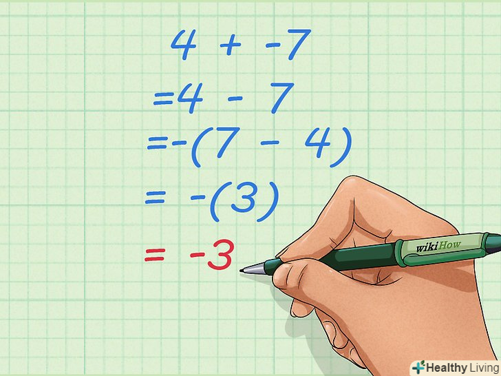 Якщо при заміні додавання негативно числа на віднімання позитивного числа ви отримали завдання, в якій потрібно відняти більше число з меншого (наприклад, 4 – 7), відніміть менше число з більшого, а перед відповіддю напишіть знак мінус.- Наприклад, дана задача 4 +(-7).