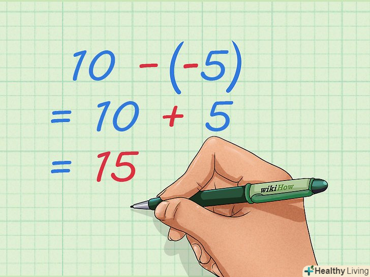 Віднімання від'ємного числа. При відніманні негативного числа потрібно просто додати позитивне число (пам'ятайте, що мінус на мінус дає плюс).- Наприклад, уявіть, що негативне число-це вкрадені гроші. Якщо ви віднімаєте вкрадені гроші у грабіжника (тобто віднімаєте негативне число), то у вас стає більше грошей (тобто, ви додали число).