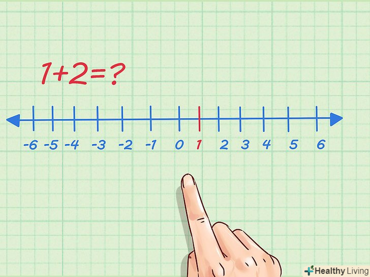 Наприклад, вирішіть 1 + 2 за допомогою числової прямої. перше число в задачі – це 1, тому покладіть палець на це число на числовій прямій.- Ви, швидше за все, знаєте результат додавання 1 + 2. Це на краще: якщо ви знаєте відповідь, Вам буде легше зрозуміти, як користуватися числовою прямою. Потім ви можете використовувати числову пряму для вирішення більш складних завдань.