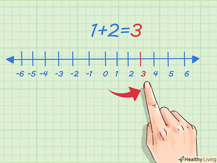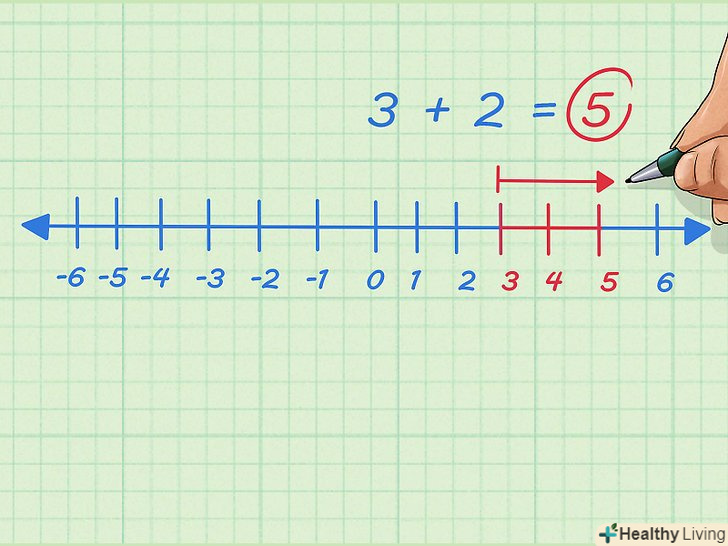 Складайте цілі позитивні числа, рухаючись по числовій прямій вправо.наприклад, вирішіть 3 + 2. Почніть з 3 і перемістіть палець на 2 мітки вправо. Під міткою, на якій ви зупинилися, буде цифра 5. Це і є результат додавання 3 + 2 = 5.