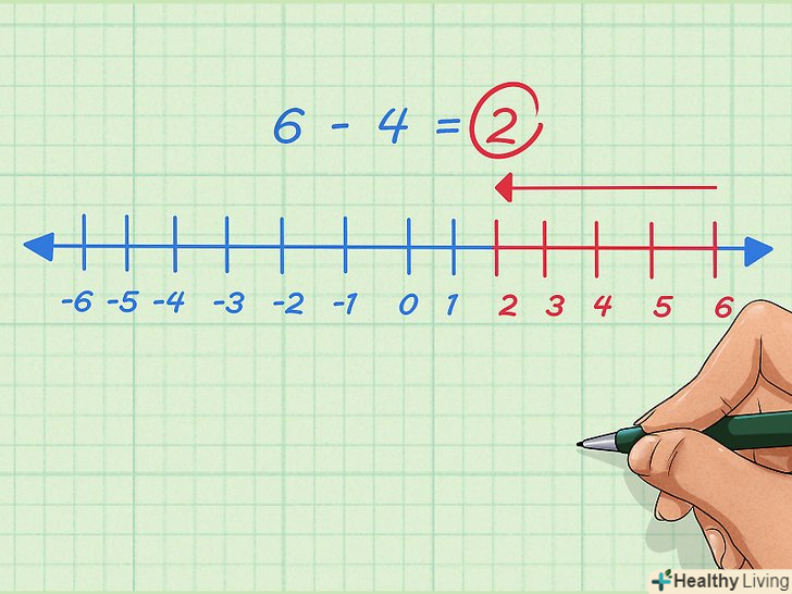 Віднімайте цілі позитивні числа, рухаючись по числовій прямій вліво. Наприклад, вирішите 6 - 4. Почніть з 6 і перемістіть палець на 4 мітки вліво. Під міткою, на якій ви зупинилися, буде цифра 2. Це і є результат віднімання 6-4 = 2.