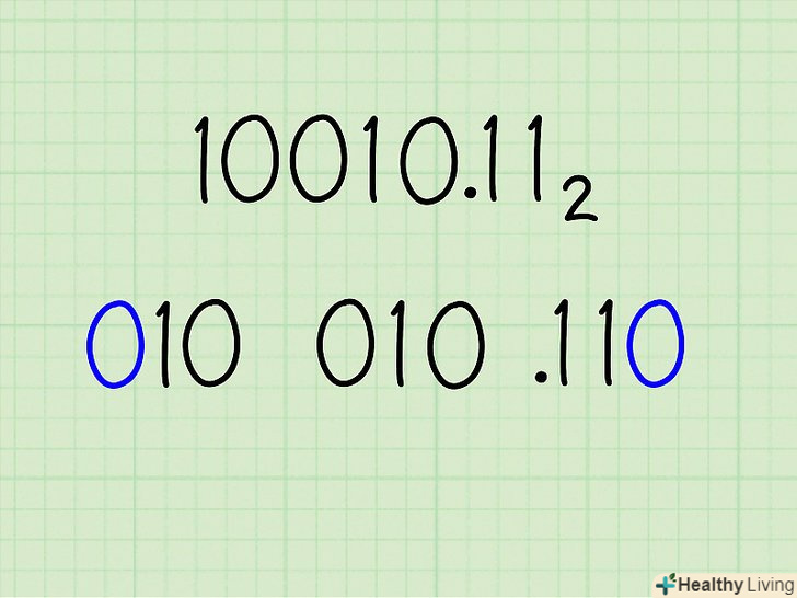 Перетворіть двійкове число з десятковою комою.наприклад, потрібно перетворити двійкове число 10010,11 в вісімкове. В цьому випадку розбиття числа, яке знаходиться до коми, на групи по три цифри треба починати з коми і рухатися вліво. У нашому прикладі розбийте 10010 і отримаєте 010 010. Тепер, розбиття числа, яке знаходиться після коми, на групи по три цифри треба починати з коми і рухатися вправо. У нашому прикладі розбийте 11 і отримаєте 110. Приписуйте нулі з того боку, в яку рухаєтеся. Остаточне розбиття на групи: 010 010, 110.- 101,1 →101 , 100