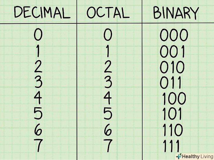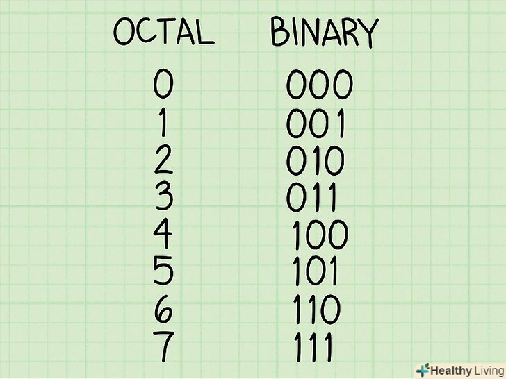 Використовуйте таблицю перетворення, щоб конвертувати вісімкове число в двійкове.таблиця необхідна, тому що, наприклад, проста цифра 3 не надасть достатньої інформації, щоб виконати математичні операції (пропустіть цей крок, якщо знайомі з вісімковою системою і хочете самостійно виконати перетворення). Використовуйте наступну таблицю, щоб перетворити кожну цифру вісімкового числа в групу з трьох цифр-ці групи потрібно записати один біля одного, щоб отримати двійкове число:- 0 → 000