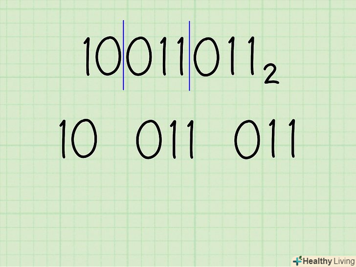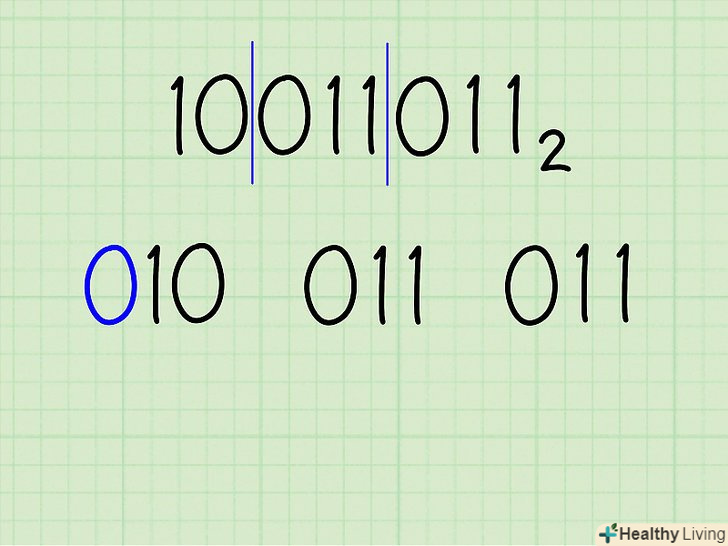 Розбийте двійкове число на групи по три цифри, починаючи праворуч.у двійкових числах використовуються дві цифри, а у вісімкових вісім цифр. Оскільки, з трьох цифр двійкового числа вийде одна цифра восьмеричного числа. Число розбивайте на групи справа наліво. Наприклад, розбийте двійкове число 101001 так: 101 001.