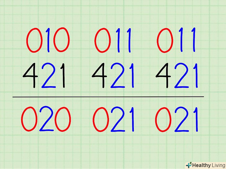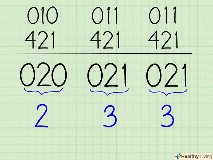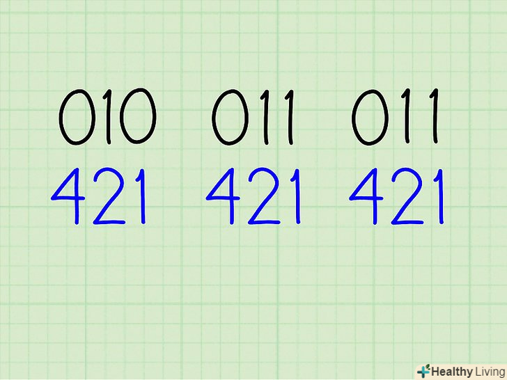 Навчіться розпізнавати двійкові числа.такі числа включають тільки дві цифри: 1 і 0, наприклад, 101001, 001 або навіть 1. У деяких книгах і підручниках двійкові числа позначаються індексом «2«, наприклад, 10012, щоб не переплутати це число з десятковим числом»одна тисяча один".- Цей індекс позначає основу числа. У двійковій системи підставою є 2, а у вісімковій — 8.
