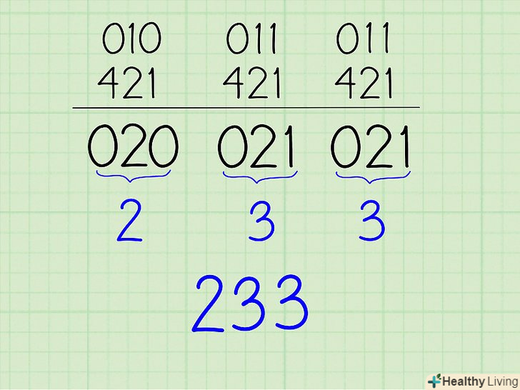 Приступите до перетворення.якщо над будь-яким розрядом (4, 2 або 1) ви бачите 1, знизу запишіть відповідну цифру (4, 2 або 1). Наприклад, якщо над 4 стоїть 1, знизу запишіть 4. Якщо над розрядом знаходиться 0, знизу запишіть 0. Наприклад:- Завдання:
