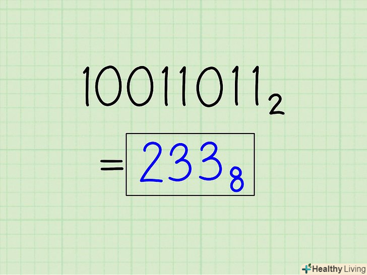 Припишіть (ліворуч) нулі, якщо в якійсь групі менше трьох цифр. наприклад, в двійковому числі 10011011 вісім цифр; число 8 не ділиться на 3, але це двійкове число можна перетворити в вісімкове. Просто припишіть (зліва) нулі до цифр неповної групи. Наприклад:- Вихідне двійкове число: 10011011