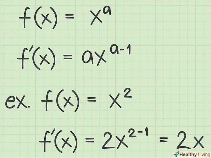 Застосуйте правило диференціювання статечної функції. якщо під коренем стоїть змінна x,, похідна береться наступним чином:[3]