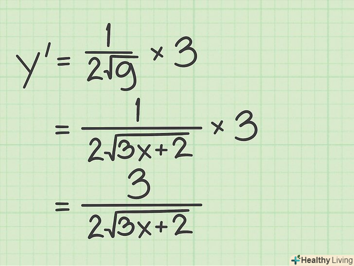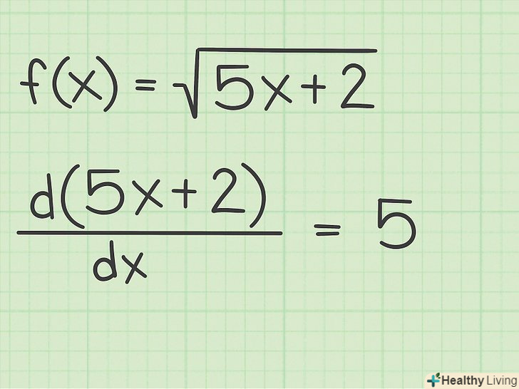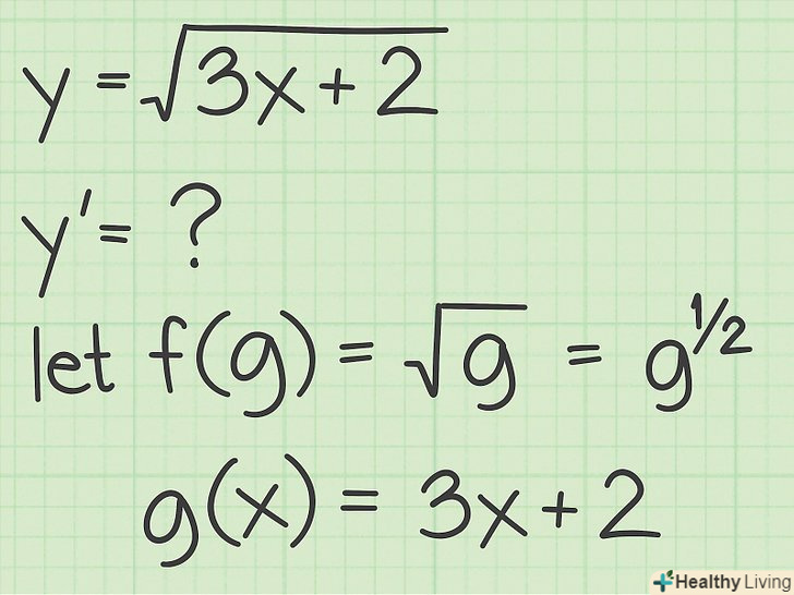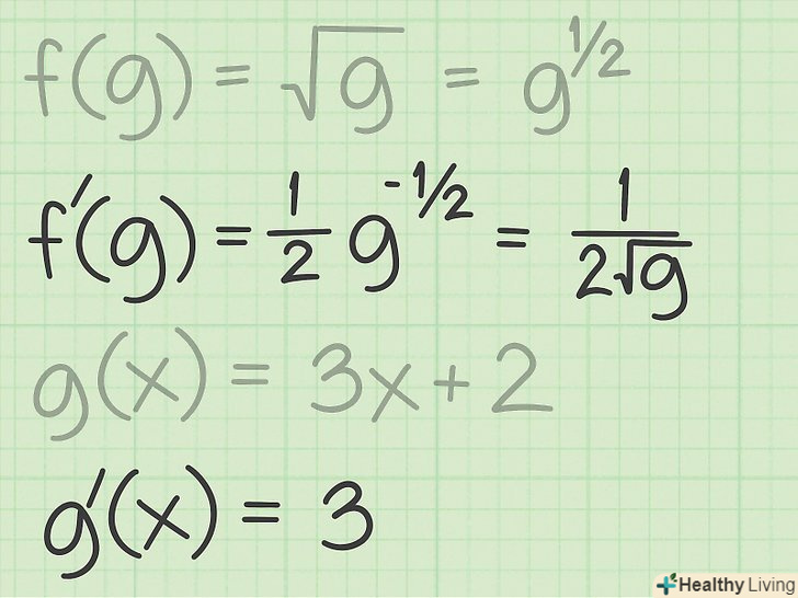 Знайдіть похідні обох функцій. щоб застосувати правило диференціювання складних функцій до квадратного кореня, спочатку слід знайти похідну квадратного кореня:[7];