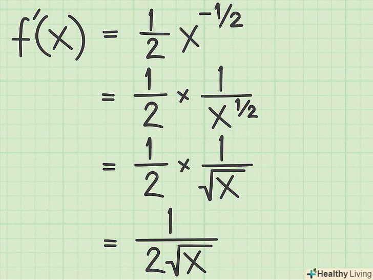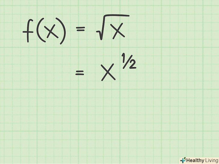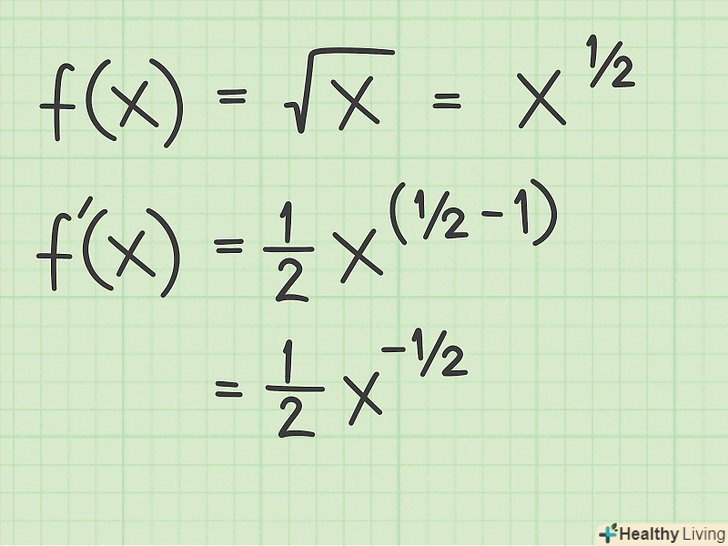 Запишіть квадратний корінь у вигляді статечної функції.щоб знайти похідну квадратного кореня, згадайте, що його можна переписати у вигляді статечної функції. При цьому стоїть під коренем величина записується у вигляді підстави, яке зводиться в ступінь 1/2. Розглянемо наступні приклади:[2];