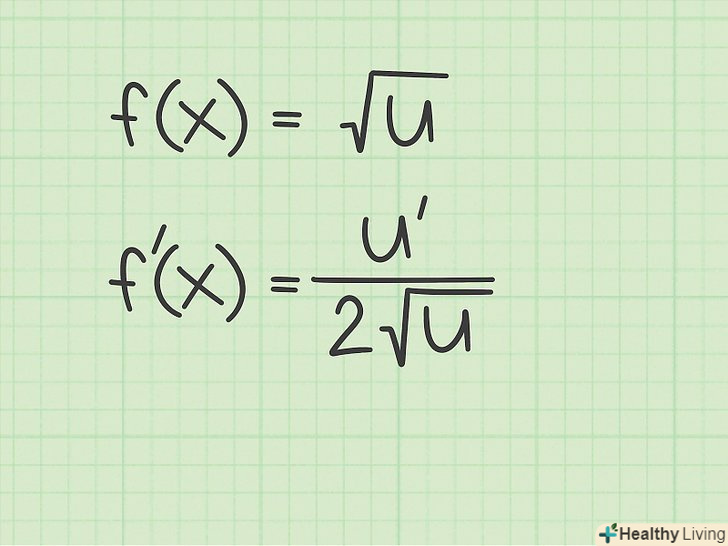 Запам'ятайте просте правило диференціювання будь-яких квадратних коренів.якщо необхідно знайти похідну квадратного кореня, під яким стоїть змінна або функція, використовуйте наступне правило. Результат завжди буде являти собою похідну підкореного виразу, поділену на подвоєний початковий квадратний корінь. Це можна записати наступним чином:[9]- Якщо