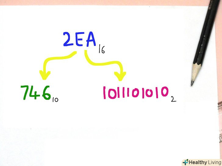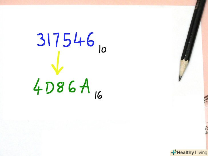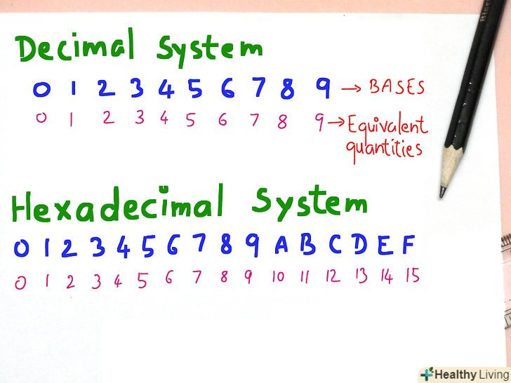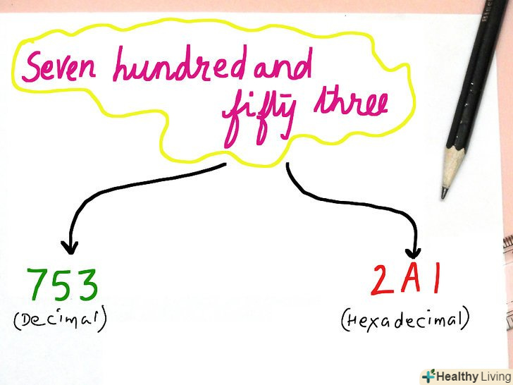 У десятковій системі будь-яке число може бути записано з використанням десяти цифр (0-9).аналогічно в шістнадцятковій системі будь-яке число може бути записано з використанням шістнадцяти символів (цифр 0-9 і букв А-F).- Наприклад, число "сімсот п'ятдесят три" в десятковій системі числення записується як 753, а в шістнадцятковій – як 2f1.