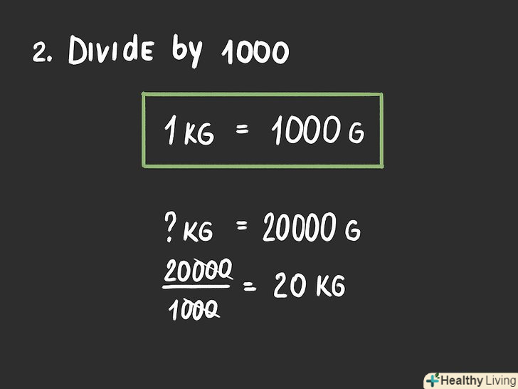 Поділіть на 1.000. Кілограм містить тисячу грамів. Це означає, що для перекладу грамів в кілограми необхідно просто поділити кількість грамів на 1.000.- У нашому прикладі ми отримаємо число кілограмів, поділивши 20.000 грамів на 1.000.