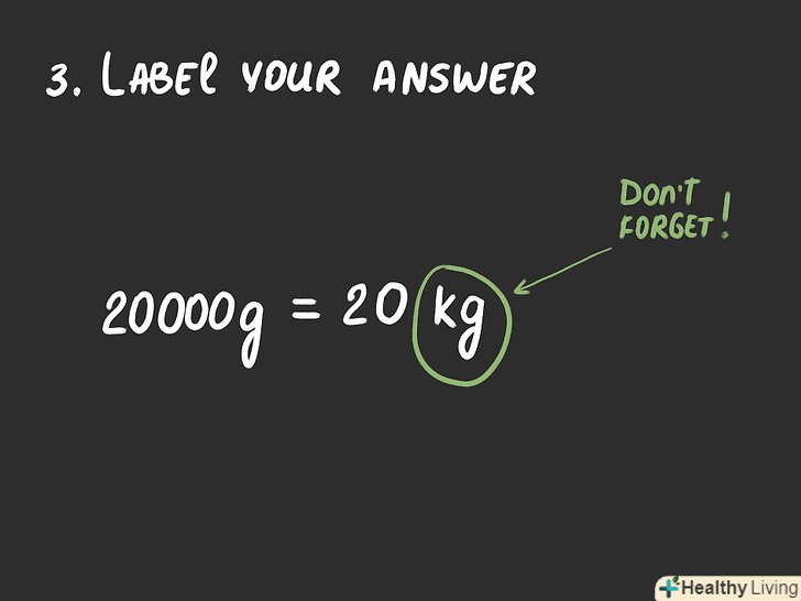 Підпишіть отриману відповідь.не забувайте про цей крок! Важливо забезпечити отриману відповідь відповідними одиницями виміру. Якщо ви не вкажете одиниці виміру при виконанні шкільної роботи, вам можуть знизити оцінку. Якщо ви переводите грами в кілограми з будь-якою іншою метою, інші можуть переплутати одиниці виміру в ваших записах.- У нашому прикладі ми ставимо біля відповіді позначку " кілограм":