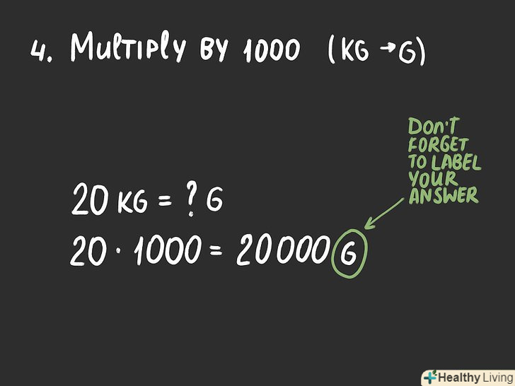 Для переходу назад до грамів помножте кількість кілограмів на 1.000.як зазначалося вище, в кілограмі міститься тисяча грамів. Це означає, що якщо ви захочете перейти назад від кілограмів до грамів, вам буде потрібно просто помножити число кілограмів на 1.000. Оскільки множення є операцією, "зворотною" поділу, тим самим ви" скасуєте " попереднє ділення і знову отримаєте вагу в грамах.- Для перекладу 20 кілограмів назад в грами ми просто множимо кількість кілограмів на 1.000 (знову не забудьте підписати відповідь):