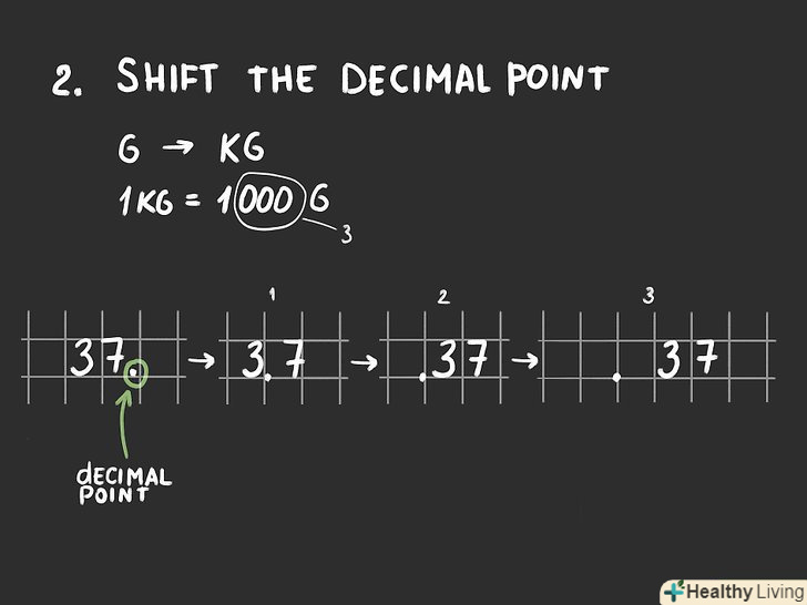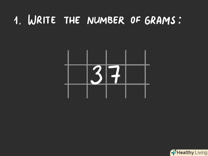 Почніть з кількості грамів.як це не дивно, при перекладі грамів в кілограми і назад можна обійтися без всяких обчислень. Це можливо завдяки тому, що в метричній системі використовується десяткова система числення. Іншими словами, метричні одиниці виміру відрізняються один від одного в число разів, кратне 10: в одному сантиметрі 10 міліметрів, 100 сантиметрів складають метр, в кілометрі міститься 1.000 метрів і так далі.- В даному розділі переведемо 37 грамів в кілограми. Почнемо з того ж, що і в попередньому розділі, записавши "37 грамів" на аркуші паперу.