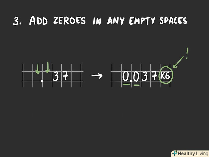 Перенесіть десяткову кому на три позиції вліво. знайдіть положення десяткової коми в числі, що позначає грами. Якщо це ціле число, десяткова кома зазвичай не записується, але при цьому мається на увазі, що вона стоїть після крайньої правої цифри. Перенесіть кому на три позиції вліво. Одній позиції відповідає одна цифра. Якщо ви перетнули крайню ліву цифру, продовжуйте зрушувати кому, відзначаючи прогалини.- У нашому прикладі десяткова кома знаходиться праворуч від цифри 7, тобто 37 грамів можна записати як 37,0 грамів. Послідовно переносячи десяткову кому на три позиції вліво, отримуємо:
