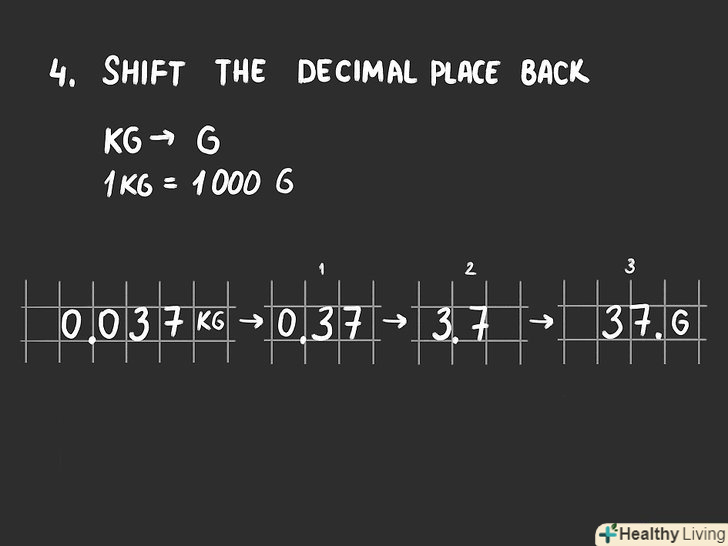 Для переходу назад до грамів слід перенести десяткову кому назад.маючи кілограми, пересуньте кому на три позиції вправо, і ви знову отримаєте грами. Після цього можна опустити нулі, проставлені замість пробілів на попередньому кроці.- У нашому прикладі послідовне перенесення десяткової коми на три позиції вправо виглядає наступним чином: