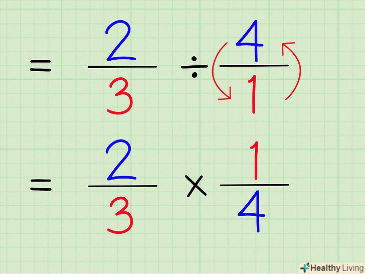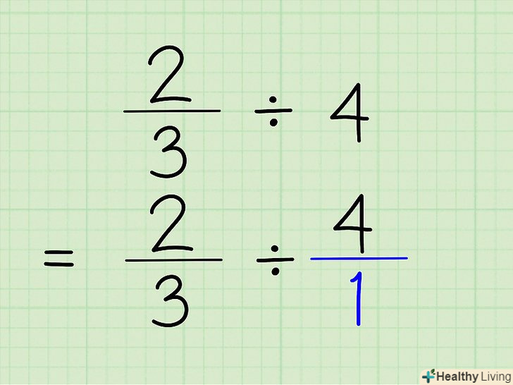 Переведіть ціле число в дріб.зробити це досить просто. Запишіть ціле число в чисельник, а 1-в знаменник. Виходить дріб! У нашому прикладі 4 перетворюється на 4/1 (те ж саме, що і 4). Тепер наш приклад набув вигляду 2/3 ÷ 4/1.[2]