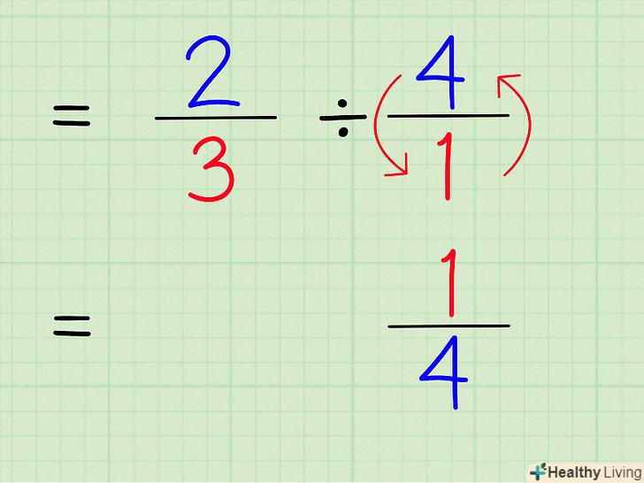 - Беріть зворотне тількиДругийдробу, тієї,на яку ділимо . Першу (ту, яку ділимо) не міняйте. У нашому прикладі ми змінили 4/1 на 1/4, але залишили 2/3 як 2/3 (ми не змінювали її на 3/2).