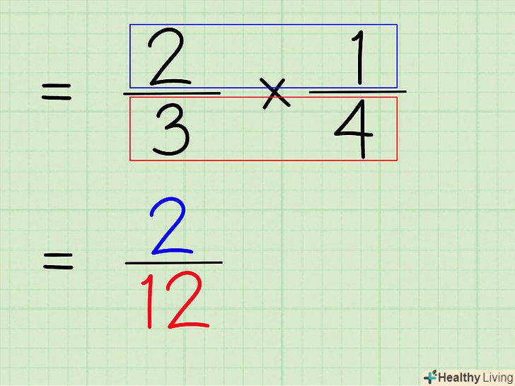 Перемножте дроби між собою.чисельник множиться на чисельник, знаменник - на знаменник, що вийшов відповідь і стане рішенням нашого прикладу.[5]- Чисельники: 2 x 1 = 2.
