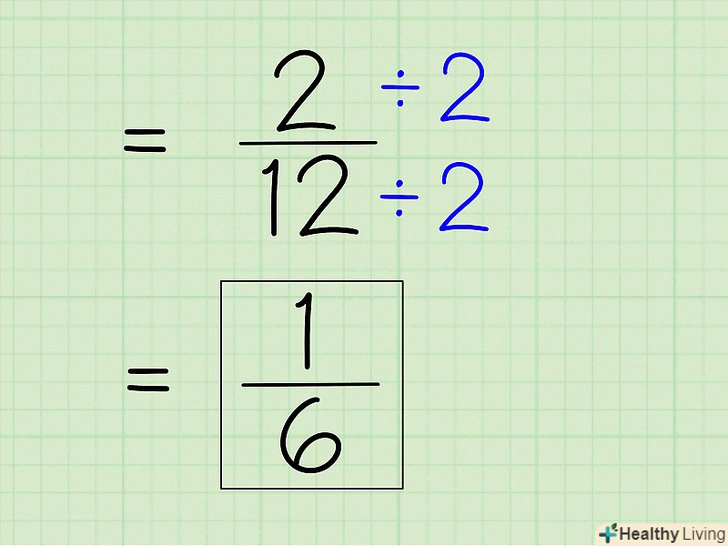 Скоротіть дріб . для цього вам знадобиться найбільший спільний дільник, тобто те найбільше число, на яке діляться без залишку і чисельник, і знаменник. У нашому випадку це 2. І чисельник (2), і знаменник (12) прекрасно діляться на двійку (парні числа завжди добре діляться на 2). Тепер, відповідно, розділіть чисельник і знаменник на 2, щоб отримати скорочене уявлення дробу.[6]- 2 ÷ 2 = 1