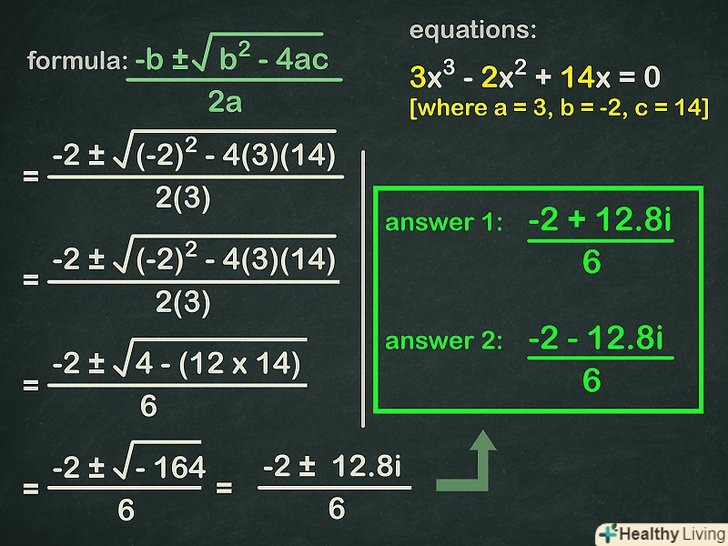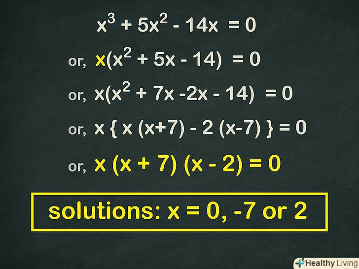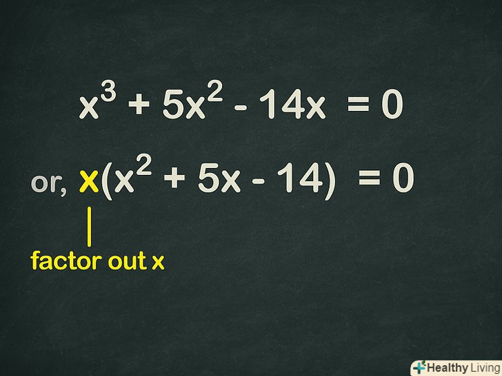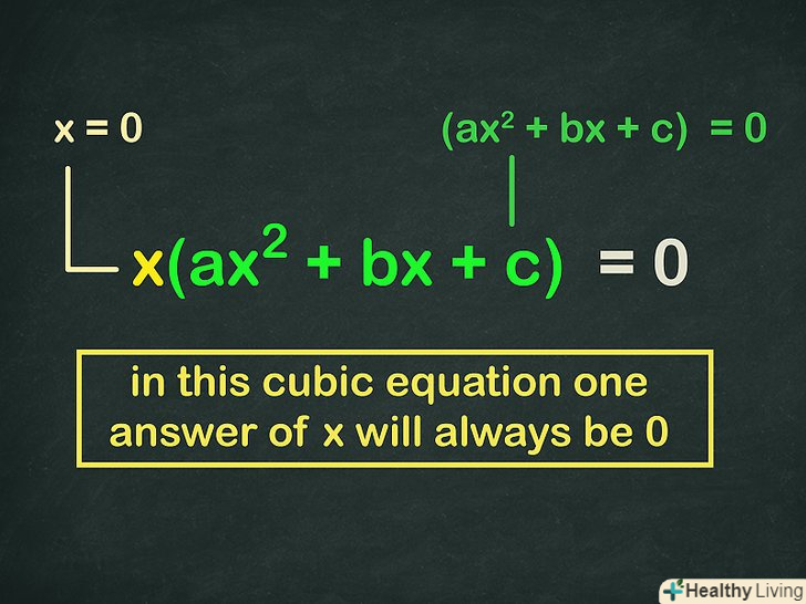Використовуйте нуль і коріння квадратного рівняння як рішення кубічного рівняння.у квадратних рівнянь два корені, а у кубічних — три. Два рішення Ви вже знайшли-це коріння квадратного рівняння. Якщо ж ви винесли» х "за дужки, третім рішенням буде.[6]
