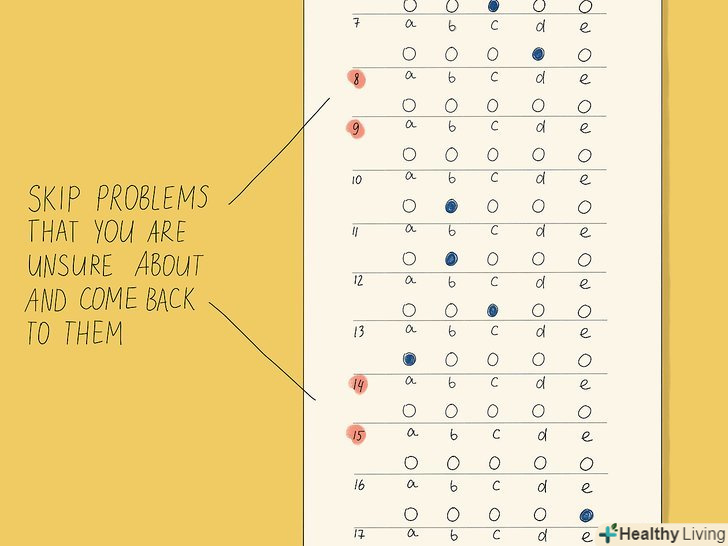Пропустіть ті завдання, в яких ви не впевнені, щоб повернутися до них пізніше.найкраще вирішити спочатку легкі завдання, так як на це піде менше часу. Якщо ви зіткнулися із завданням, яка викликає у вас складності, пропустіть її і поверніться до неї після того, як розправитеся з найбільш легкими завданнями.[13]Порада: це означає, що вам доведеться вирішувати якісь завдання не по порядку, проте не турбуйтеся! Це набагато краще, ніж намагатися вирішити всі завдання по порядку і не вкластися у відведений час.