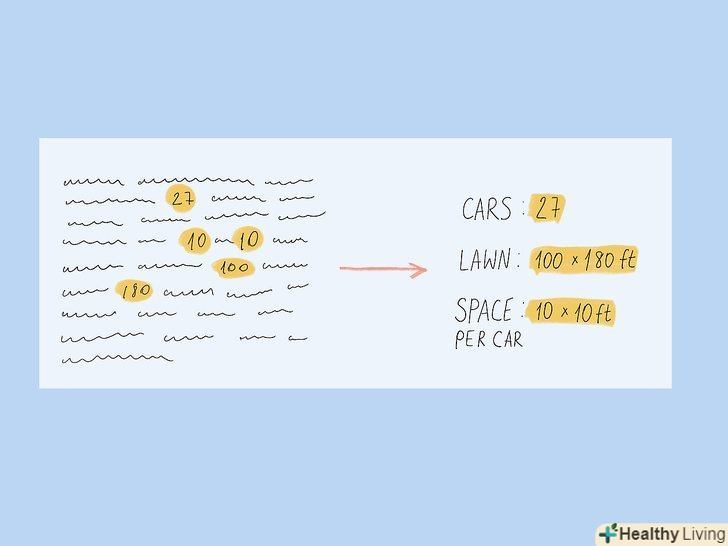 Прочитайте умови завдань і випишіть наведені в них величини.умови завдань можуть бути дуже заплутаними, особливо якщо вони містять багато додаткової інформації, яка не сприяє знаходженню рішення. Витратьте хвилинку на те, щоб спочатку прочитати умову кожного завдання і визначити відповідні числа, які знадобляться для її вирішення. Потім підставте ці числа в потрібну формулу і знайдіть відповідь.[14]- Як приклад розглянемо наступне завдання: "Петру необхідно припаркувати на стоянці 27 автомобілів, причому кожен автомобіль займає площу 3х3 метри. Розміри стоянки складають 30×55 метрів. Скільки Автомобілів зможе розмістити Петро на цій стоянці?».