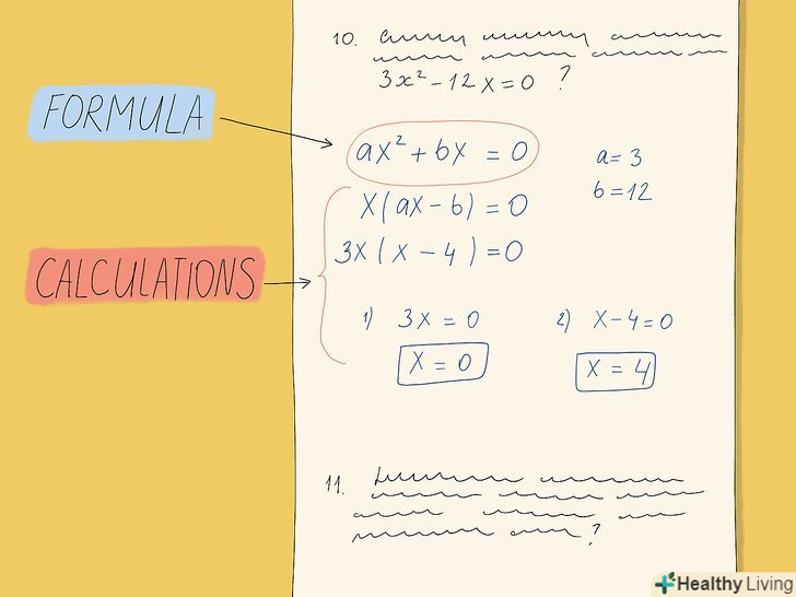 Перегляньте рішення задач і по можливості додайте додаткову інформацію.навіть якщо ви отримали неправильну відповідь, деякі вчителі нараховують додаткові бали за те, що учень продемонстрував свої знання і вміння вирішувати даний тип завдань. Доповніть рішення кожного завдання якомога більшою кількістю деталей, особливо якщо ви не впевнені в тому, що отримали правильну відповідь.[15]- Наприклад, якщо для вирішення завдання необхідно використовувати ту чи іншу формулу, спочатку запишіть цю формулу в загальному вигляді. Після цього підставте в формулу відповідні величини, запишіть необхідні проміжні обчислення, і лише потім приведіть отриману відповідь.