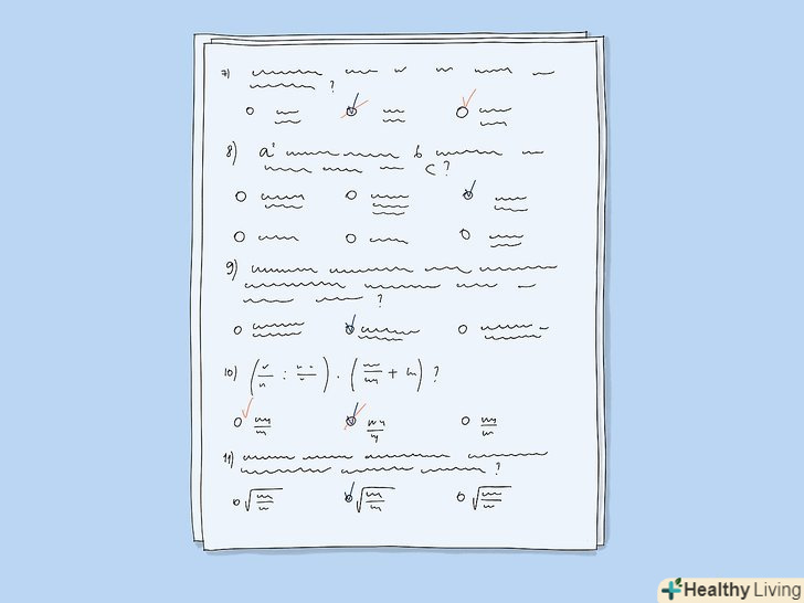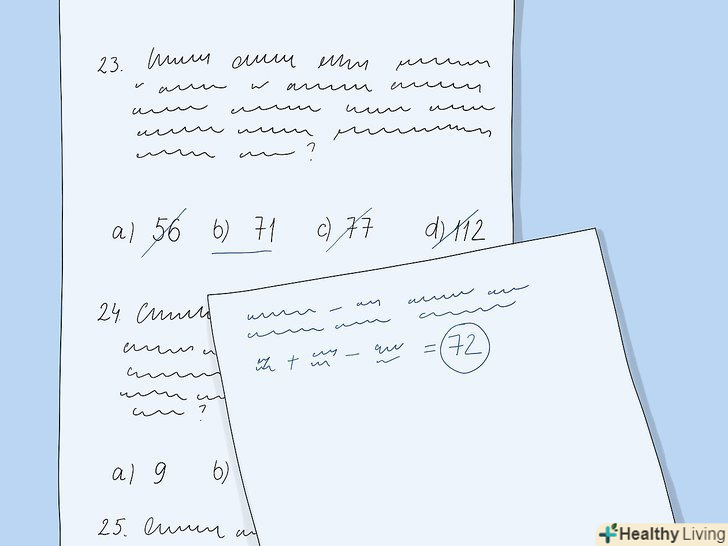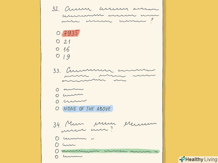 Виключіть ті варіанти, які ви вважаєте неправильними.на іспиті вам можуть попастися завдання з декількома варіантами відповіді, щодо вирішення яких ви не впевнені. Щоб збільшити свої шанси на більш високу оцінку, можна виключити ті відповіді, які здаються вам неправильними. Спробуйте вирішити проблемну задачу, а потім виключіть свідомо невірні відповіді.[16]- Припустимо, ви вирішили задачу і в результаті отримали 72, проте є такі варіанти відповіді: а) 56, б) 71, В) 77, г) 112. Можна виключити варіанти "a» і "г", так як вони сильно відрізняються від отриманого вами відповіді. Найкраще вибрати варіант "б", оскільки він найближче до вашої відповіді.