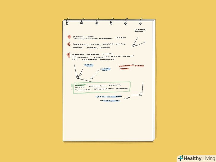 Переглядайте свої записи і приділяйте особливу увагу тому матеріалу, якому буде присвячений іспит. Хороший конспект надасть вам велику допомогу при підготовці до іспиту. Намагайтеся читати записи в той же день, коли ви зробили їх, щоб закріпити пройдений в класі матеріал.[3]- Наприклад, можна переглядати конспект відразу після уроків, перед виконанням домашнього завдання або в інший відведений для навчання час.