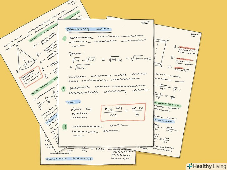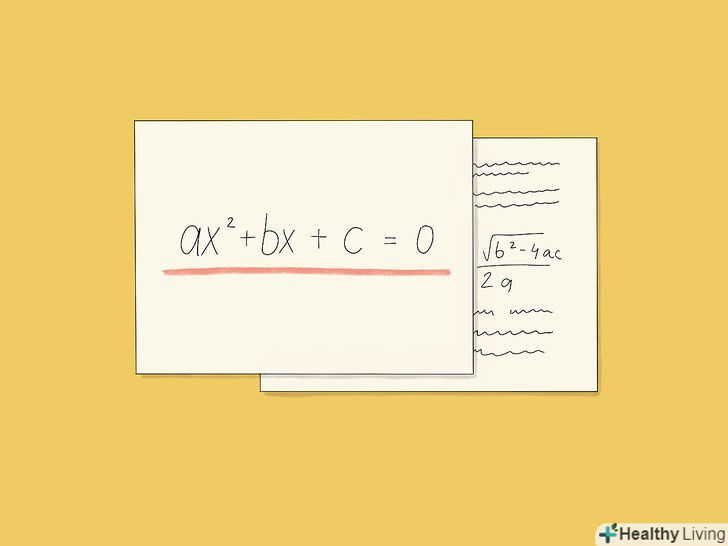 Зробіть флеш-картки, щоб вивчити важливі поняття і формули.це невеликі картки з інформацією з обох сторін. Флеш-картки допоможуть вам запам'ятати математичні формули, ключові визначення та поняття. На одній стороні картки запишіть формулу, визначення або поняття, а на другій дайте пояснення або наведіть приклад.[6]- Наприклад, якщо ви хочете запам'ятати формулу для вирішення квадратного рівняння, можна записати її на одній стороні картки, а з іншого боку пояснити, як нею користуватися, і привести відповідний приклад.