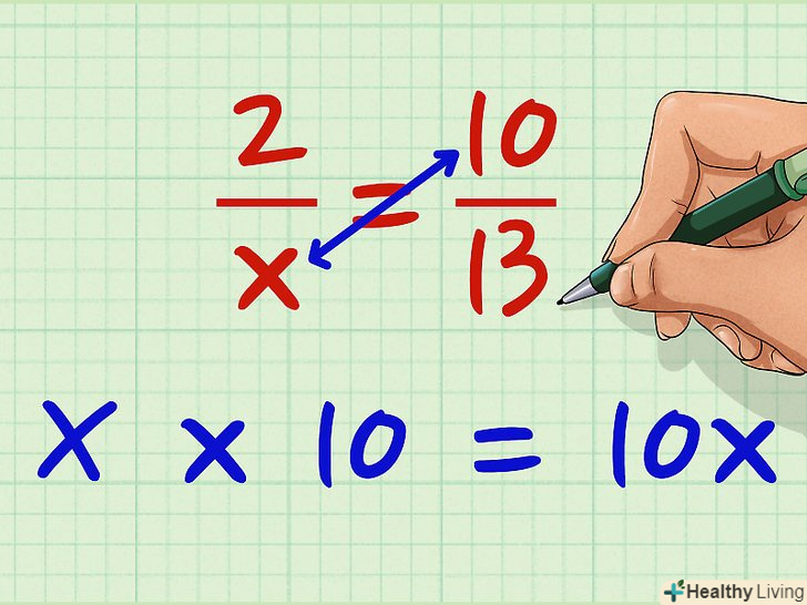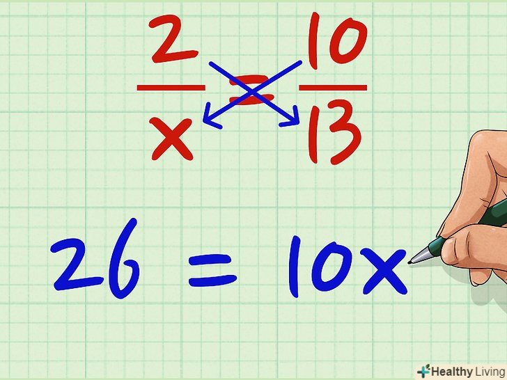 Помножте чисельник дробу, яка зліва, на знаменник дробу, яка праворуч.наприклад, нам дано рівняння 2 / x = 10/13. помножте 2 на 13. 2 x 13 = 26.