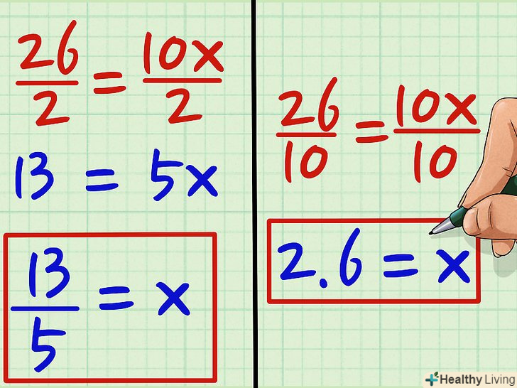 Прирівняйте відповіді. напишіть 26 дорівнює 10x. 26 = 10x.послідовність запису відповідей не має значення. Тільки не розділяйте відповіді на множники.- Отже, якщо ви намагаєтеся вирішити рівняння 2 / x = 10/13 для x, то у вас вийде 2 * 13 = x * 10, або 26 = 10x.