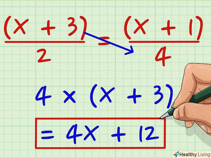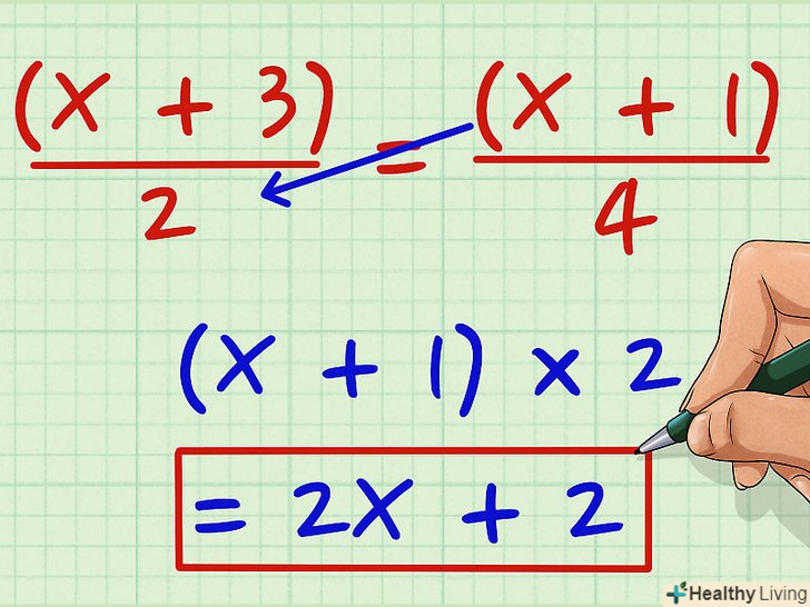 Помножте чисельник лівого дробу на знаменник правого.наприклад, нам дано таке рівняння: (x + 3)/2 = (x + 1)/4. Помножте (x + 3) на 4, вийде 4 (x +3). відкрийте дужки, вийде 4x + 12.
