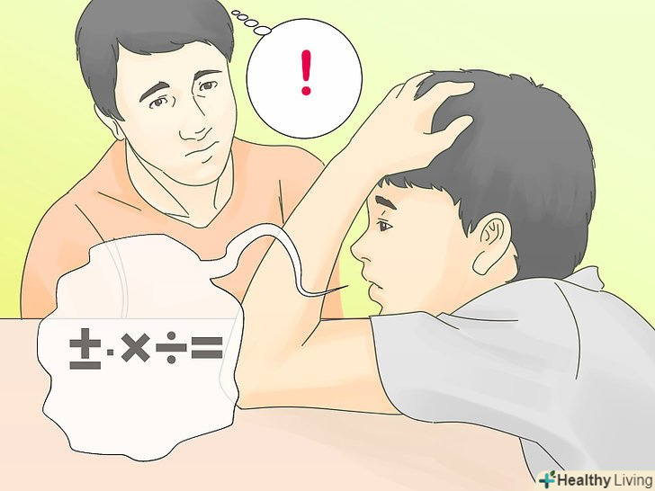 Навчіться дізнаватися ознаки фобії у дитини.якщо дитині не Цікава математика або він боїться робити домашню роботу, це означає, що цей предмет може викликати у нього занепокоєння. Дитина може говорити, що він ніколи не розбереться в математиці або що він недостатньо розумний для того, щоб зрозуміти цей предмет.[10]- Поспостерігайте за поведінкою дитини. Він засмучується саме тоді, коли потрібно займатися математикою, або його засмучує щось інше?