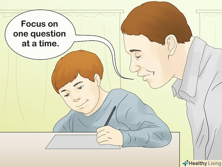 Пропонуйте дитині розбиратися з одним завданням за раз.якщо покласти перед дитиною тест з 30 питаннями, він напевно розгубиться. Прочитати книгу за один присід неможливо, тому не варто намагатися робити те ж саме з математикою. Пропонуйте дитині вирішувати по одному прикладу за раз.- Якщо дитина зіткнеться зі складним прикладом, запропонуйте йому пропустити його і повернутися до нього пізніше. Якщо дитина зможе відповісти на прості питання, він буде відчувати себе впевненіше, коли дійде до складних.