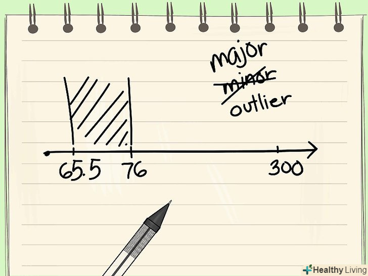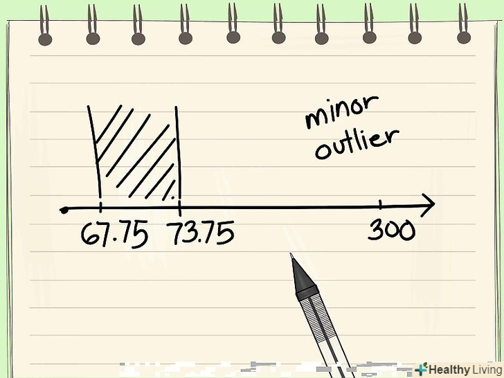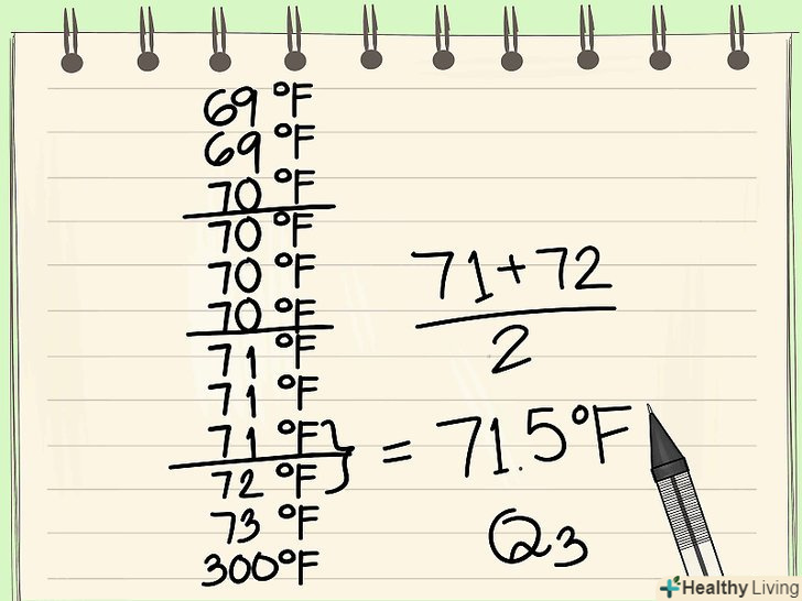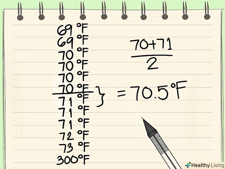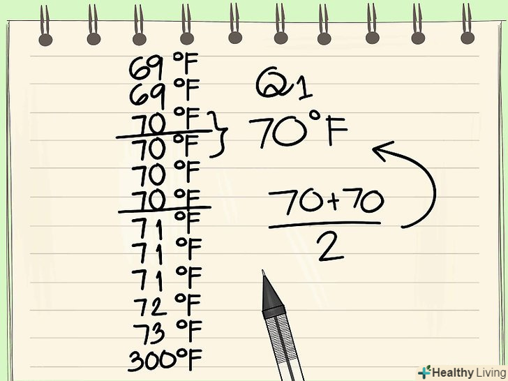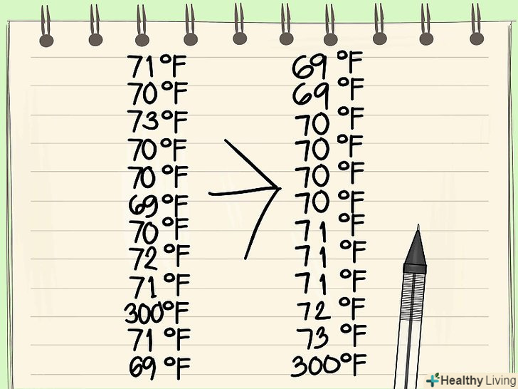 Упорядкуйте дані по зростанню.перший крок при визначенні викидів-це обчислення медіани набору даних. Це завдання значно спрощується, якщо значення в наборі даних розташовані за зростанням (від меншого до більшого).- Продовжуючи наведений вище приклад, розглянемо наступний набір даних, що представляє температури декількох об'єктів: {71, 70, 73, 70, 70, 69, 70, 72, 71, 300, 71, 69}. Цей набір повинен бути впорядкований наступним чином: {69, 69, 70, 70, 70, 70, 71, 71, 71, 72, 73, 300}.