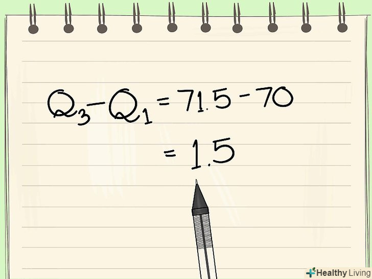 Обчисліть міжквартильний діапазон.обчисливши Q1 і Q3, необхідно знайти відстань між цими величинами. Для цього відніміть Q1 з Q3. Значення міжквартильного діапазону вкрай важливо для визначення меж значень, які не є викидами.- У нашому прикладі Q1 = 70, а Q3 = 71,5. Міжквартильний діапазон дорівнює 71,5 - 70 = 1,5.