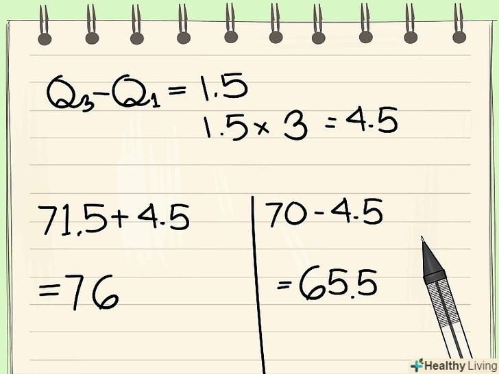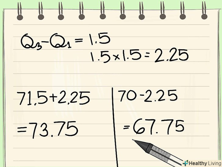 - У нашому прикладі міжквартильний діапазон дорівнює (71,5-70) = 1,5. Далі: 1,5 * 1,5 = 2,25. Це число потрібно додати до Q3 і відняти його з Q1, щоб знайти внутрішні кордони: