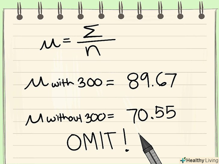 Зрозумійте важливість (іноді) викидів, що залишаються в наборі даних.деякі викиди повинні бути виключені з набору даних, так як їх причинами є помилки і технічні неполадки; інші викиди необхідно залишити в наборі даних. Якщо, наприклад, викид не є результатом помилки і / або дає нове розуміння тестованого явища, то його потрібно залишити в наборі даних. Наукові експерименти особливо чутливі до викидів-виключивши викид помилково, ви можете пропустити деяку нову тенденцію або відкриття.- Наприклад, ми розробляємо новий препарат для збільшення розміру риб в рибному господарстві. Ми будемо використовувати старий набір даних ({71, 70, 73, 70, 70, 69, 70, 72, 71, 300, 71, 69}), але на цей раз кожне значення буде представляти масу риби (в грамах) після прийому експериментального препарату. Іншими словами, перший препарат призводить до збільшення маси риби до 71 г, другий препарат – до 70 г і так далі. У цій ситуації 300 – це значний викид, але ми не повинні виключати його; якщо припустити, що не було помилок вимірювання, то такий викид – це значний успіх в експерименті. Препарат, який збільшив вагу риби до 300 грамів, діє значно краще за інших препаратів; таким чином, 300 – це найважливіше значення в наборі даних.