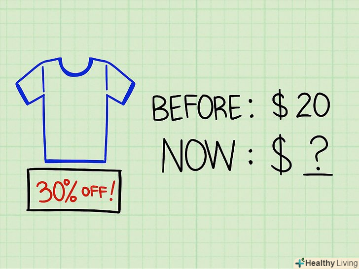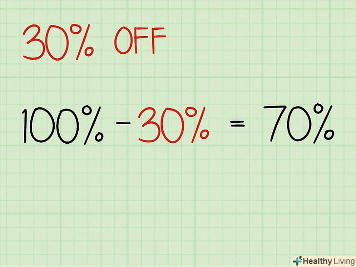 Зверніть увагу на відсоток знижки.у цьому випадку вам потрібно виконати лише одну математичну операцію замість двох. Просто відніміть відсоток знижки з 100%, щоб знайти відсоток від початкової ціни. Наприклад, якщо знижка на сорочку становить 30%, 100% – 30% = 70%, тобто за сорочку ви заплатите 70% від початкової ціни.[11]