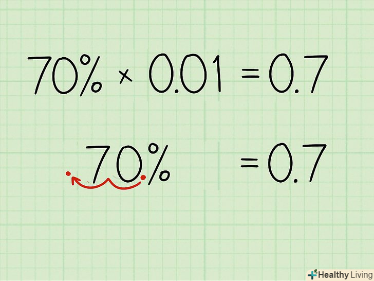 Перетворіть знайдений відсоток в десятковий дріб.для цього розділіть відсоток на 100 або помножте його на 0,01, або перенесіть десяткову кому на дві позиції вліво. У нашому прикладі 70%/100% = 70/100 = 7/10 = 0,7.[12]