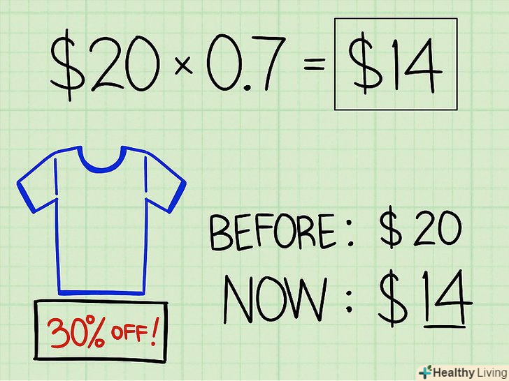 Помножте початкову ціну на десятковий дріб.наприклад, якщо сорочка коштує 2000 рублів, помножте 2000 на 0,7: 2000 х 0,7 = 1400, тобто зі знижкою сорочка продається за 1400 рублів.[13]